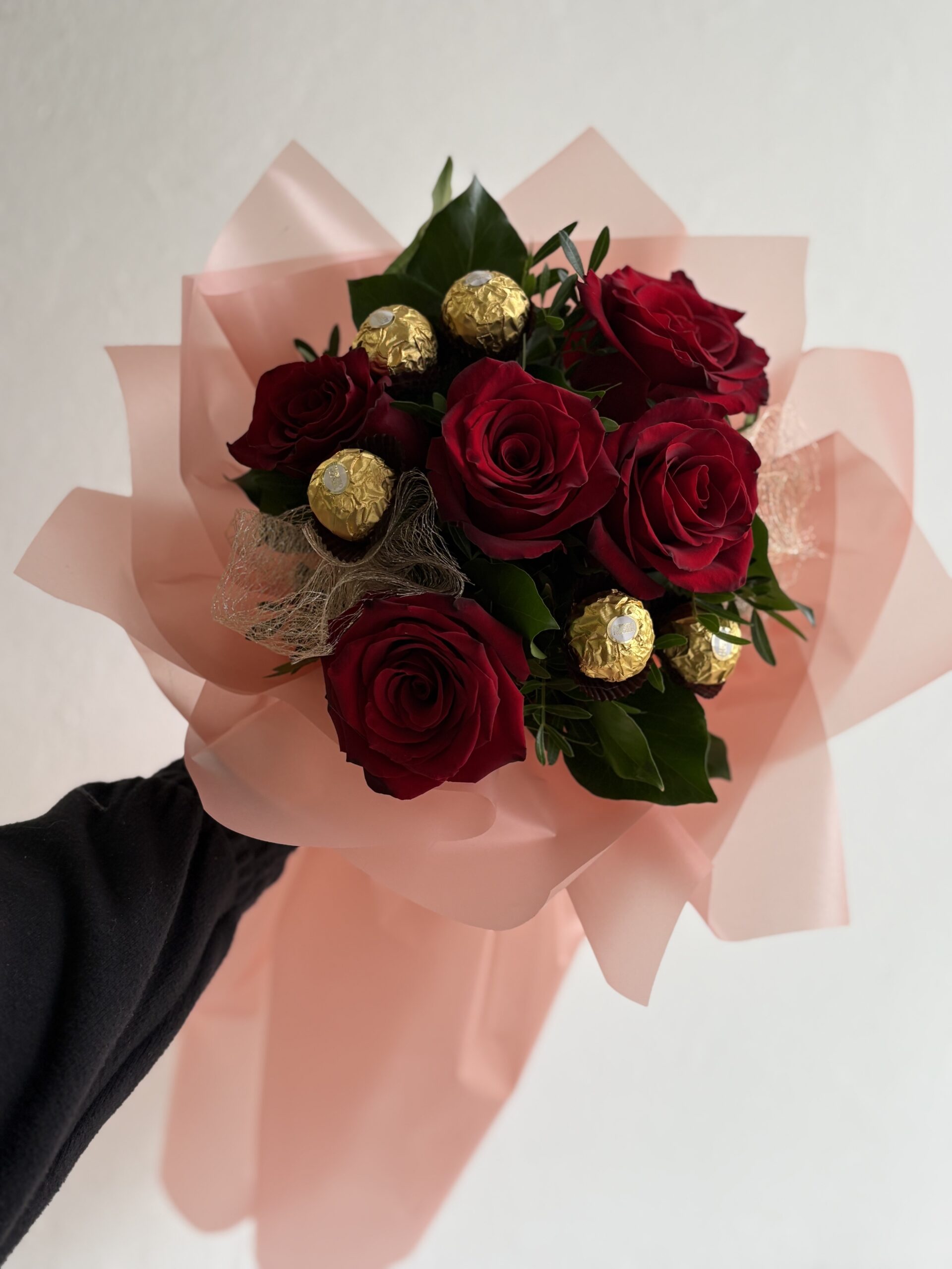 Buket svježih crvenih ruža u kombinaciji sa ferrero rocher čokoladicama.